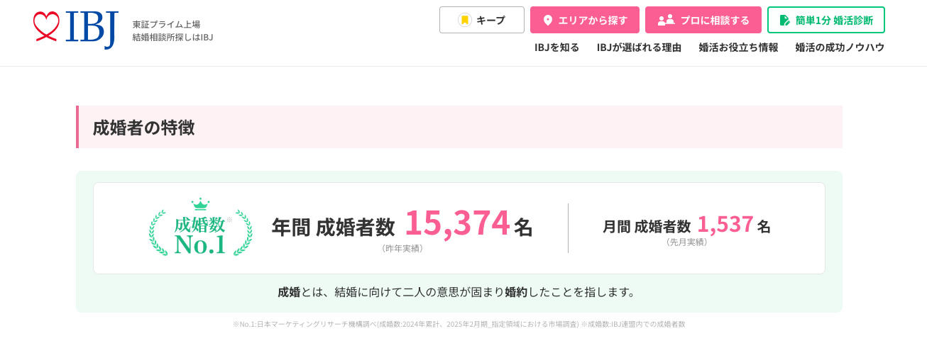 成婚者の特徴では、男女ごとのお見合い数や年齢差、交際日数などの情報を公開しているため、情報の信憑性と安心感を得られます。