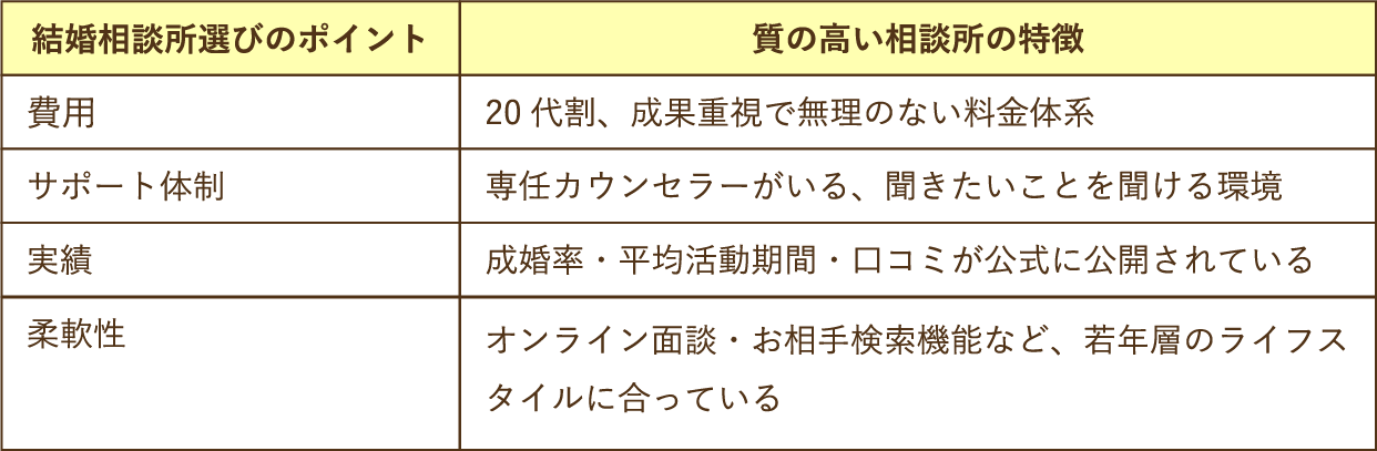 20代が相談所を選ぶ際に重視すべきは、自分との相性とサポートの質です。