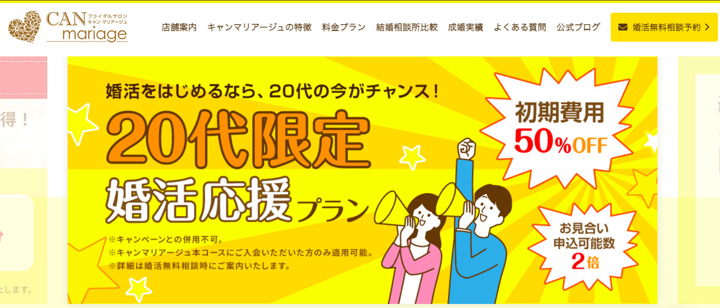 20代の成婚実績も豊富なキャンマリアージュでは、初期費用半額、お見合い申し込み可能数が2倍、成婚料25%OFFで利用できるプランがあります。