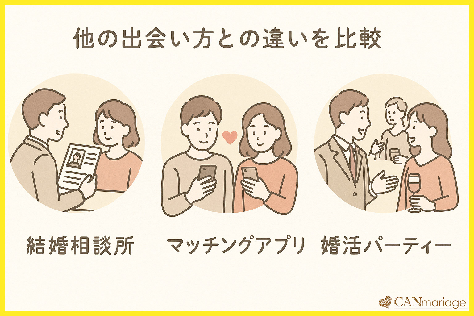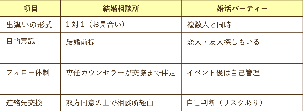 対して、結婚相談所では「年齢・年収・居住地・結婚観」などが事前に確認できるため、出逢う段階でお互いの前提条件が一致しています。