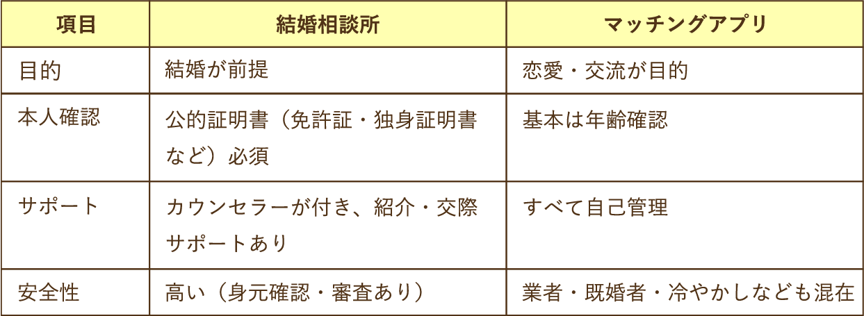 こうして見ると、マッチングアプリは「出逢う」までの手軽さに優れ、結婚相談所は「結婚までの確実性」に強みがあります。