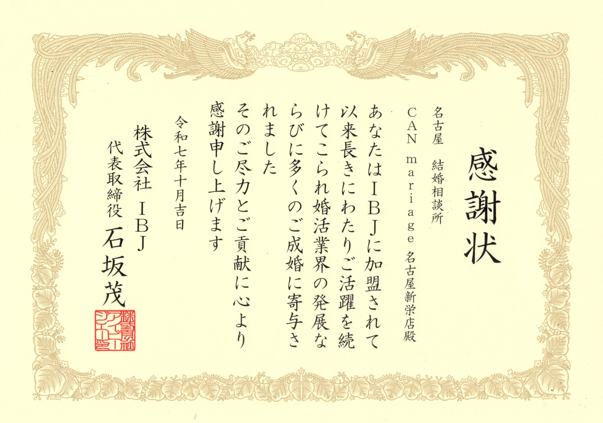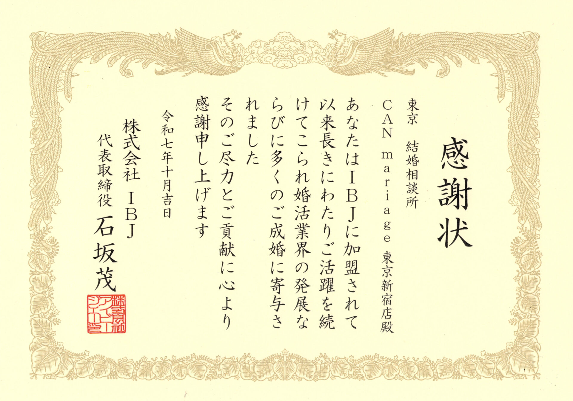 永年加盟記念は、IBJに加盟して10年以上の加盟店に贈られる特別な表彰です。長年にわたり誠実に婚活事業に取り組んできた証として、このような形で評価していただけることは、私たちにとって何よりの励みとなります。