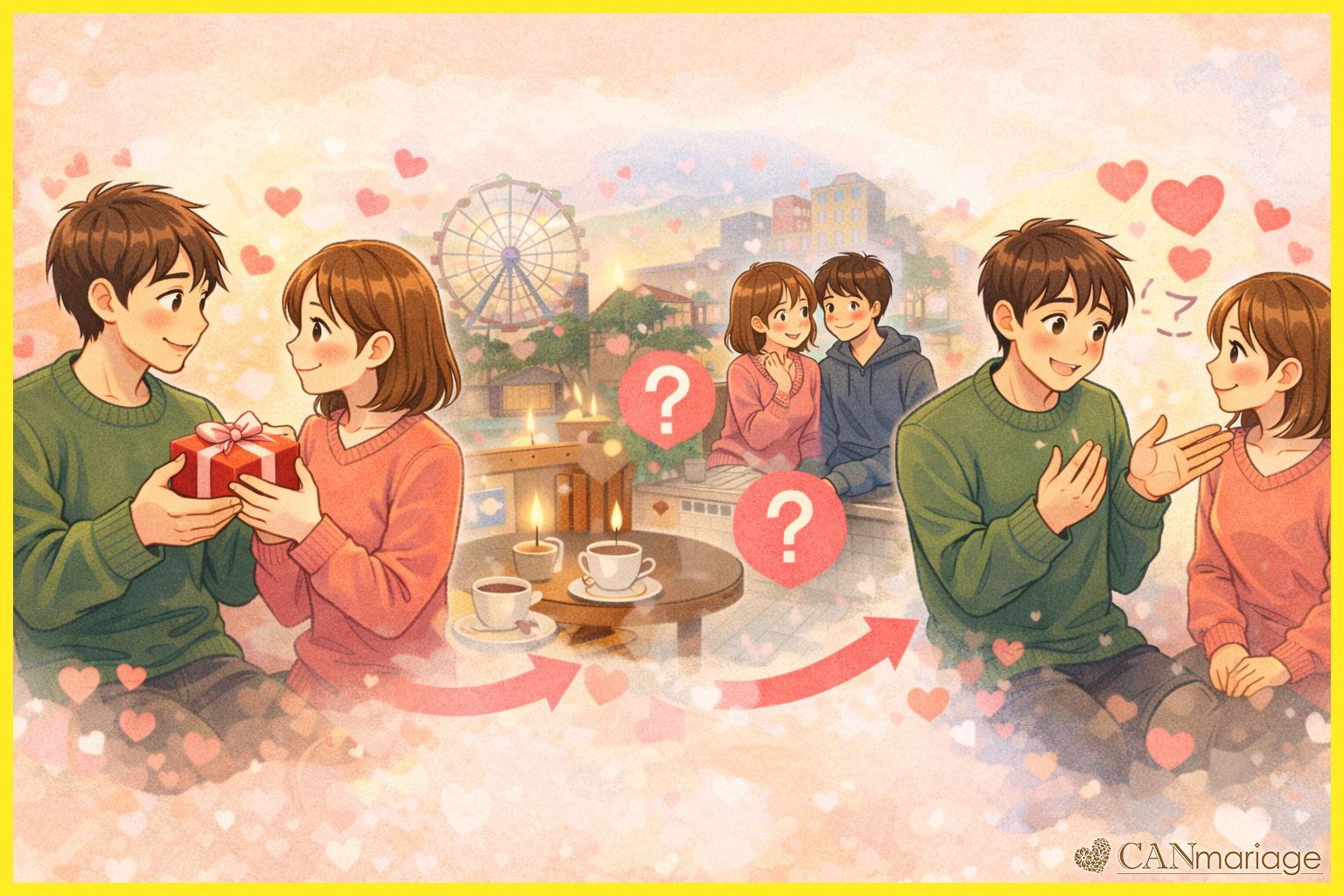 仮交際中のバレンタインデーは、多くの人が「渡すべきか」「どう受け止めるべきか」で悩むポイントです。キャンマリアージュは、結果ではなくお相手の価値観を知る機会を大切にしています。