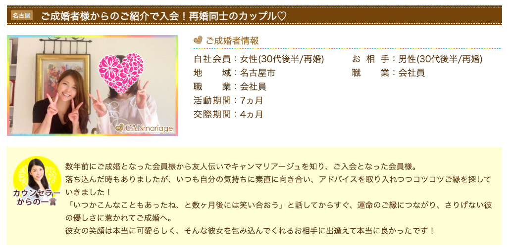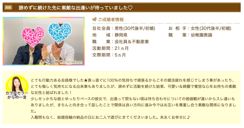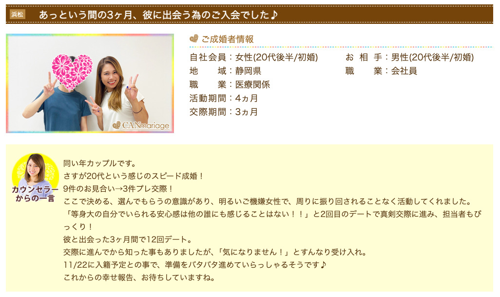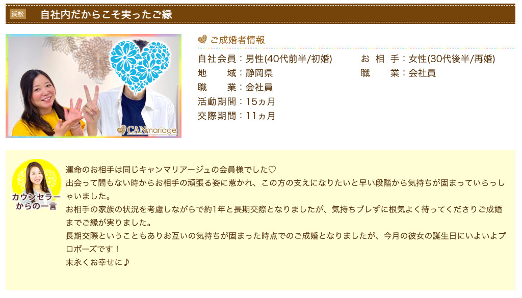 キャンマリアージュは、年代や状況の異なる成婚エピソードを多く公開しており、婚活の過程や考え方の変化まで読み取れる点が特徴です。