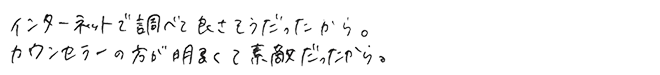インターネットで調べて良さそうだったから。カウンセラーの方が明るくて素敵だったから。